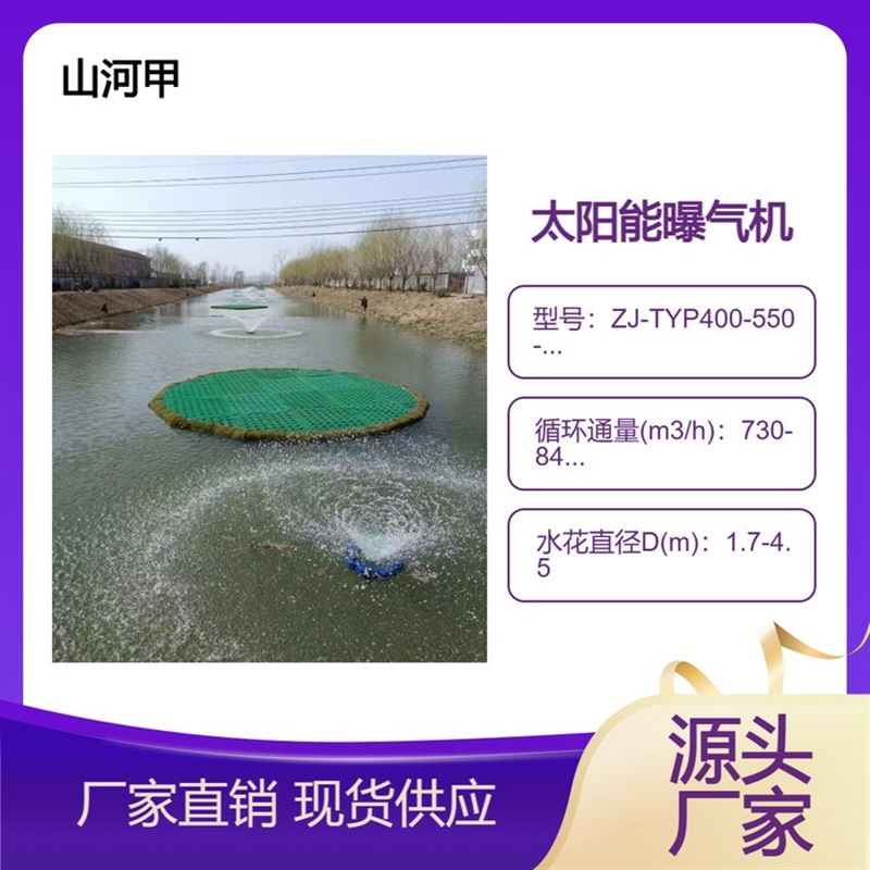 太阳能喷泉曝气机ZJ-TYP400-550-750-1000太阳能提水式(喷泉)曝气机是专门针对江河湖泊等水体净化改善水质的需要而研制开发设计的增氧、造流、循环、净化水质的高效节能的水处理设备。应用于人工及自然湖泊水体、公园、别墅区、生态住宅、高尔夫球场、城市河流湖泊、引水渠、湖泊河网水系、生态休闲乐园湖泊等景观水处理。